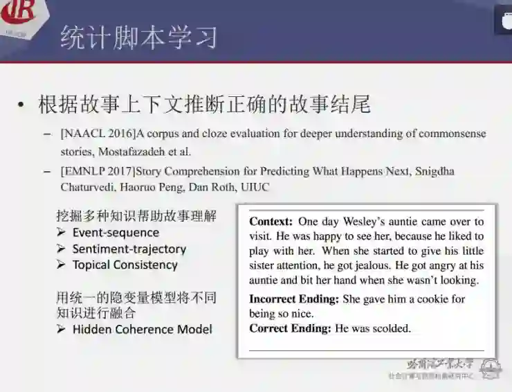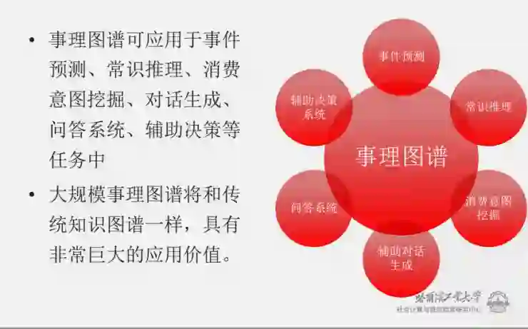 刘挺教授的总结:知识图谱在各个领域精耕细作,逐渐显露价值,但知识表示形式有待突破,推理能力有待提高。统计脚本学习和事件关系识别等事理图谱相关研究越来越吸引研究者的关注。以“谓词性短语”为节点,以事件演化(顺承、因果)为边的事理图谱方兴未艾。事理图谱必将在预测、对话等领域发挥重要作用,有力地提升人工智能系统的可解释性。