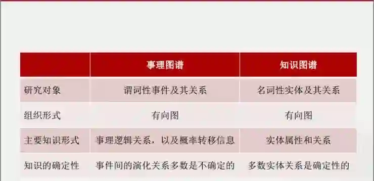 事理图谱与知识图谱的区别,知识图谱研究对象为名词性实体及其关系,事理图谱研究对象是谓词性事件及其关系。知识图谱主要知识形式是实体属性和关系,事理图谱则是事理逻辑关系以及概率转移信息。事件间的演化关系多数是不确定的,而实体之间的关系基本是稳定的。