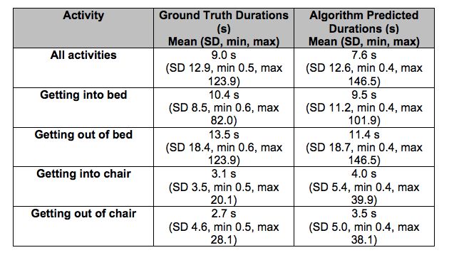 最终数据集中包含 563 个移动事件标注类别,其中 154 个属于病人离开病床、182 个属于病人移到病床、112 个属于病人离开椅子、115 个属于病人移到椅子上。最终数据集涵盖 98,801 个数据帧,时长 5.7 小时。研究者随机选取数据集中 67% 的移动活动实例和帧作为训练数据,另外 33% 作为测试数据。因此,有 379 种病人移动活动实例被用于训练,其余 184 种实例用于测试。测试数据集中病人离开病床的实例有 48 个,病人移到病床的实例有 64 个,病人离开椅子的实例有 32 个,病人移到椅子上的实例有 40 个。
