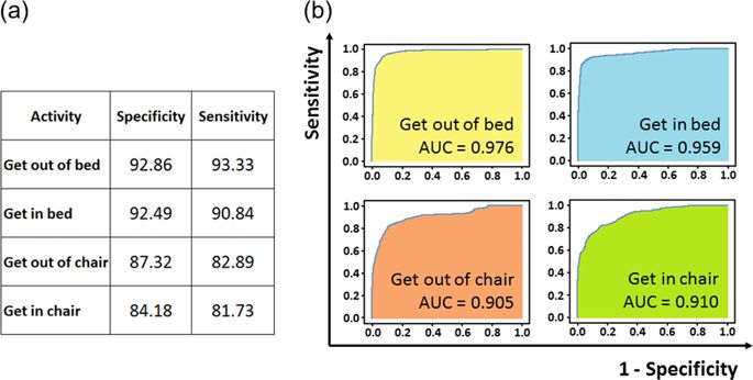 图 1:检测移动事件发生的算法性能。(a):在每一帧上评估的每个类别的特异性和敏感度。(b)每个类别的 ROC 曲线。ROC 曲线表示敏感度(真正率)和 1-特异性(假正率)之间的权衡。