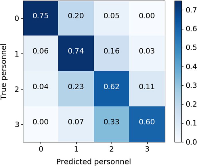 用于量化每个移动事件中医护人员数量的算法达到了 68.8% 的平均准确率。图 2 是真值 vs. 预测人数的混淆矩阵。该矩阵表明,当病人单独行动时,算法准确检测到 0 名医护人员的概率为 75%,当 1 名医护人员出现时,算法准确检测到 1 名医护人员的概率为 74%。对 2 或 3 名医护人员检测的准确率分别为 62% 和 60%。在 78% 的时间里,算法可以正确检测 2 个或更多的医护人员。