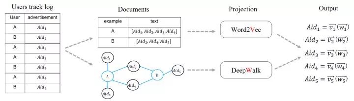 在推荐场景下,数据对象之间更多呈现的是图结构。典型的场景是由用户行为数据生成的和广告的全局关系图。这个时候word2vec就不能很好的展现这层关系,所以我们选择了Graph Embeding的方式,具体的使用了DeepWalk,可以将用户的曝光记录转化为关系图。这里引用阿里论文中的一张图,来展现DeepWalk的算法流程: