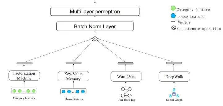 输入部分分为四组,分别是类别特征、经过Key-Value Memory处理的稠密特征、Word2Vec和DeepWalk得到了embedding向量。然后进入Batch Norm Layer,最后是MLP层。
