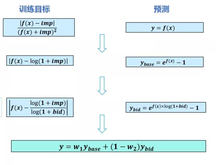 这里我们对训练目标进行了不断优化,首先是最基本的训练目标,即广告日曝光量。然后考虑到0会导致梯度不平滑,所以对训练目标做了log变换,保证梯度平滑。