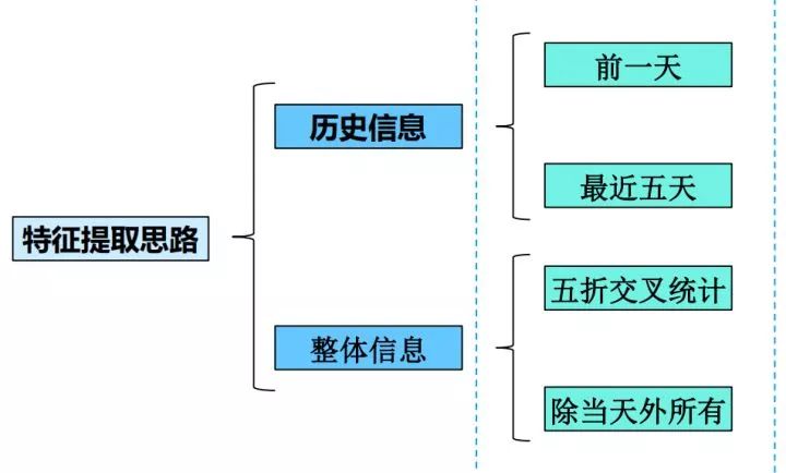 提取思路主要从两部分考虑,历史信息和整体信息,更细致些就是前一天、最近五天、五折交叉统计和除当天外所有天的统计特征。