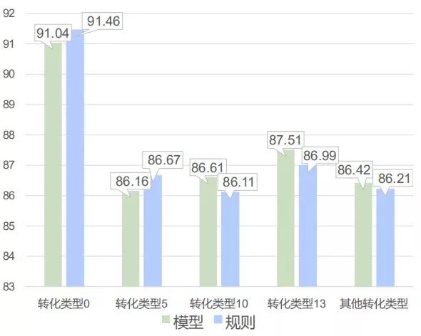 无论是模型还是规则,预测结果在不同的转化类型上得分差异都很大