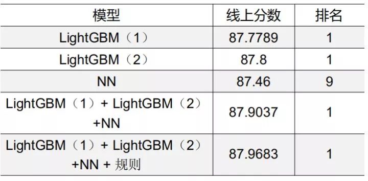 可以看出LightGBM单模既可以得到第一名的成绩,不过,为了追求更高的分数,我们团队也做了更多的尝试。
