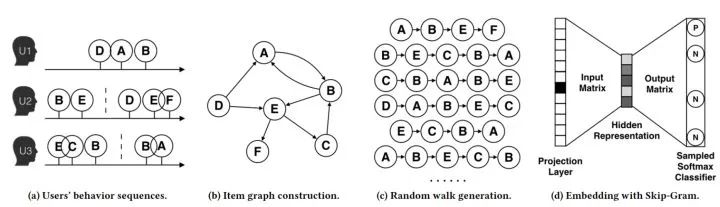 第二步:我们基于这些行为序列构建了物品关系图,可以看出,物品A,B之间的边产生的原因就是因为用户U1先后购买了物品A和物品B,所以产生了一条由A到B的有向边。如果后续产生了多条相同的有向边,则有向边的权重被加强。在将所有用户行为序列都转换成物品相关图中的边之后,全局的物品相关图就建立起来了。