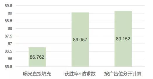这里我们对比了三种计算方法,可以看出,直接用历史曝光填充效果最差。接下来就是用竞争胜率*请求数,分数会高很多,更近一步就是按广告位分开计算,达到最好的效果。这里是在验证集上进行的计算。