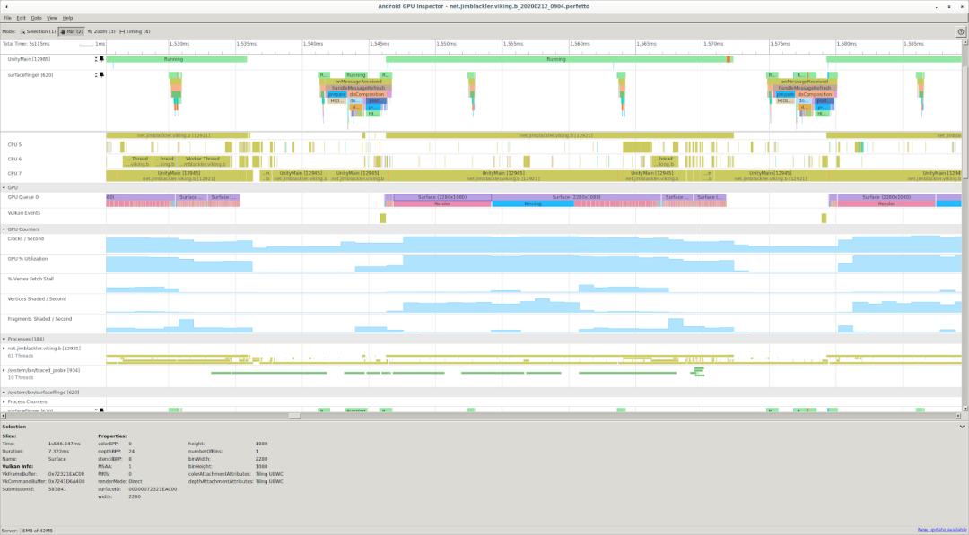 AGI 是一款图形分析工具,可让您查看 Android 设备的 GPU 工作情况,从而更好地了解图形瓶颈,并优化基于 3D 图形 API 的游戏和应用性能。该工具可显示正在运行的游戏或应用的事件时间轴,包括系统活动、高频 GPU 硬件计数器,以及 GPU 活动信息 (如果您使用的是 Vulkan)。