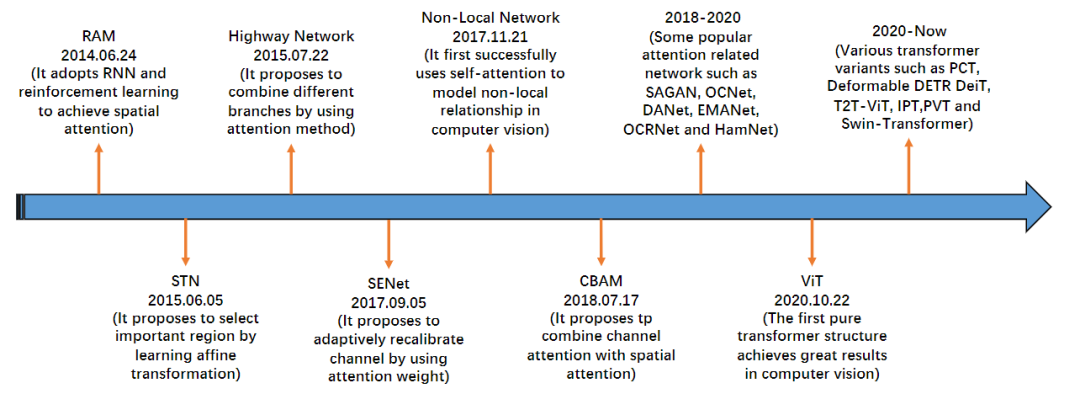 在过去的十年里,注意力机制在计算机视觉中发挥了越来越重要的作用。研究进展可大致分为四个阶段。