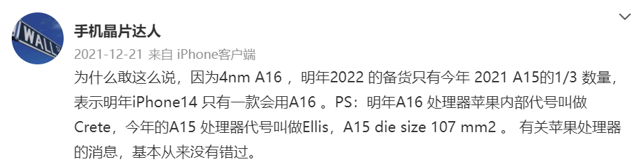 早在去年 12 月份,@手机晶片达人 便已经爆料称,不是所有的 2022 iPhone 14 都会升级到 A16 处理器,iPhone 14 将继续使用 A15 处理器。@手机晶片达人 还曾透露称,苹果 A16 处理器采用 4nm 工艺制程,代号为 Crete,且 2022 年的备货量仅有 2021 年 A15 备货量的三分之一。