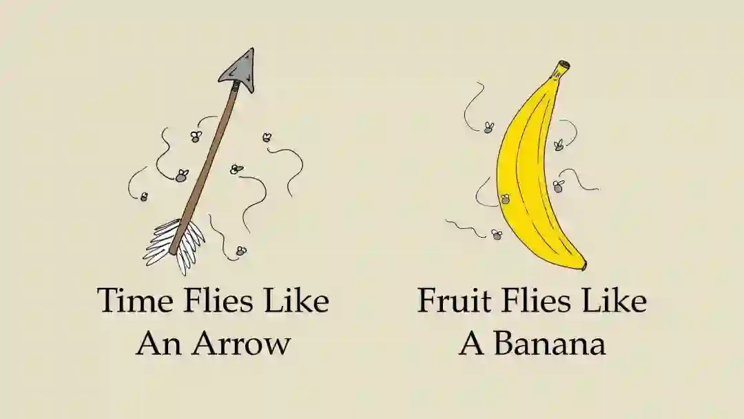 解析:「Time flies like an arrow. Fruit flies like a banana.」是一个幽默说法,这是语言歧义的经典案例。「时间苍蝇喜欢箭,果蝇喜欢香蕉」