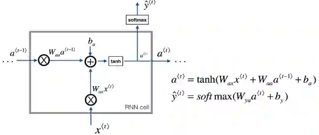 下面我们把上面按照时间线展开的RNN换一种形式表示,就是把那个圆圈给它再放大放大,进来看看细节:这个就是RNN按照时间线展开的图了,这里的符号可能和上面表示的不一样,这里我就先不统一符号了,毕竟参考的资料不一样, 希望大家能get原理, 上面这个图是取自吴恩达老师的深度学习课程, 这里的RNN-cell, 可以理解成那个隐藏层, 里面当然很多个隐藏单元, 我们可以看一下这里面的整体计算: