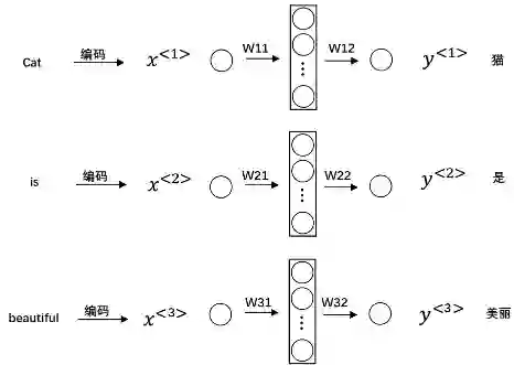 但是有些任务, 比如我们的输入是一个句子:Cat is beautiful! 让这个神经网络进行翻译, 我们一般要这么做, 首先,会把上面这3个单词转成向量的形式,要不然模型不认识, 可以通过one-hot或者embedding等, 然后我们喂入神经网络, 得到输出:应该是一个这样的过程, 上面这个图得好好理解一下, 这就是如果基于全连接网络的话会是这样的一个图, 这里之所以画成3步,就是为了后面更好的理解循环神经网络, 如果看过吴恩达老师的深度学习, 这里画的是这样的一个图: