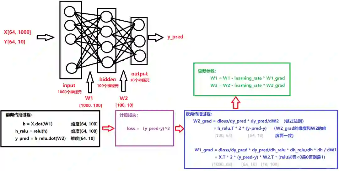 说到全连接神经网络, 我们应该是不陌生了, 并且也非常熟悉它的运算过程, 下面拿我之前画的一张图简单回顾一下神经网络:假设我有64个样本, 1000个特征,我们要做一个回归任务, 如果用普通的全连接的话, 会是下面的一个计算过程(这个相信大家都能看明白了):上面其实就是全连接网络的一个总体计算过程,左上就是一个全连接神经网络示意图, 一个全连接神经网络有一个输入层, 若干个隐藏层和一个输出层, 它的计算步骤包括前向传播, 计算损失, 反向传播, 更新参数,然后重复这个过程。具体细节就不再这里展开了, 这种网络功能也是非常强大, 由于激活函数的存在,也善于学习很复杂的非线性关系。