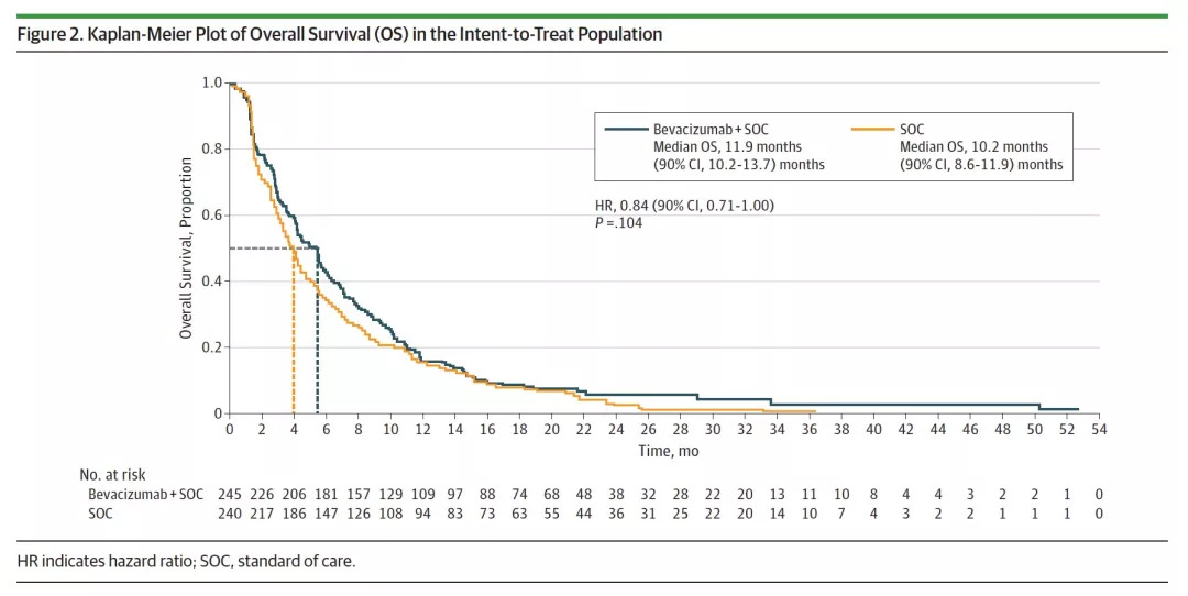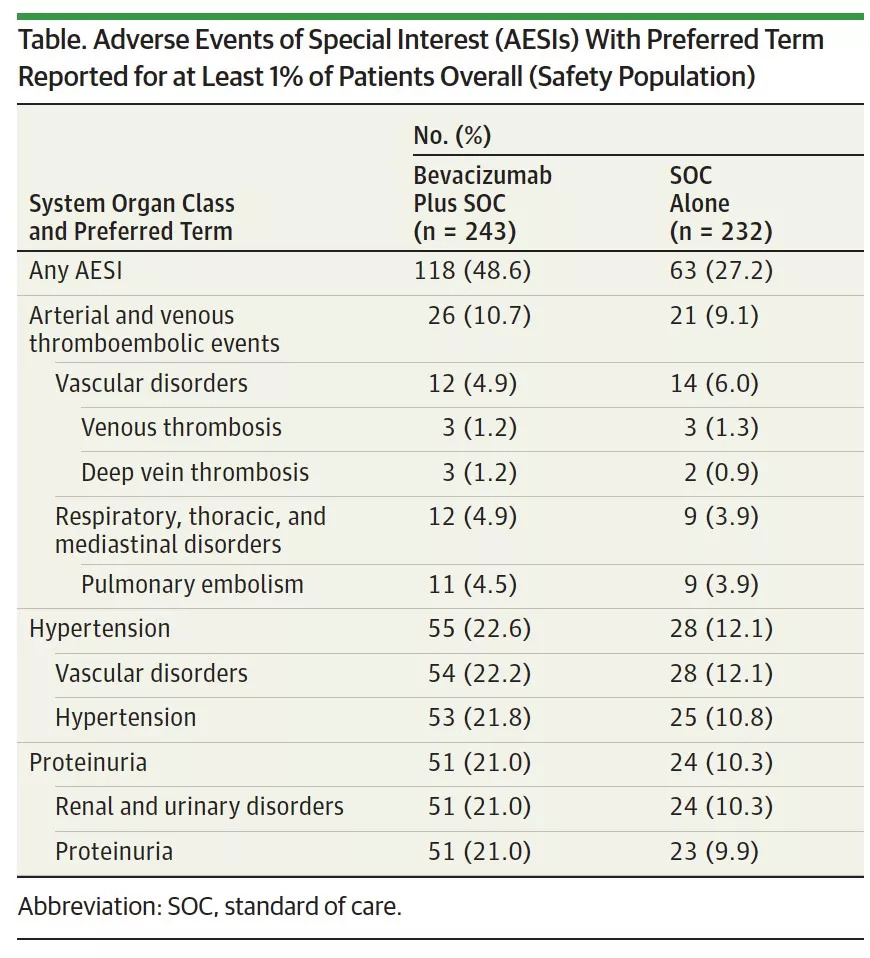 安全性分析:未观察到新的不良事件(AE),值得关注的AE总结见下表。贝伐珠单抗联合标准治疗组对比标准治疗组,值得关注的AE和3-4度AE发生率更常见,分别为48.6% vs 27.2%和76.5% vs 60.3%,总结见表1。两组分别有6.6%和5.2%的患者出现5度治疗相关AE。