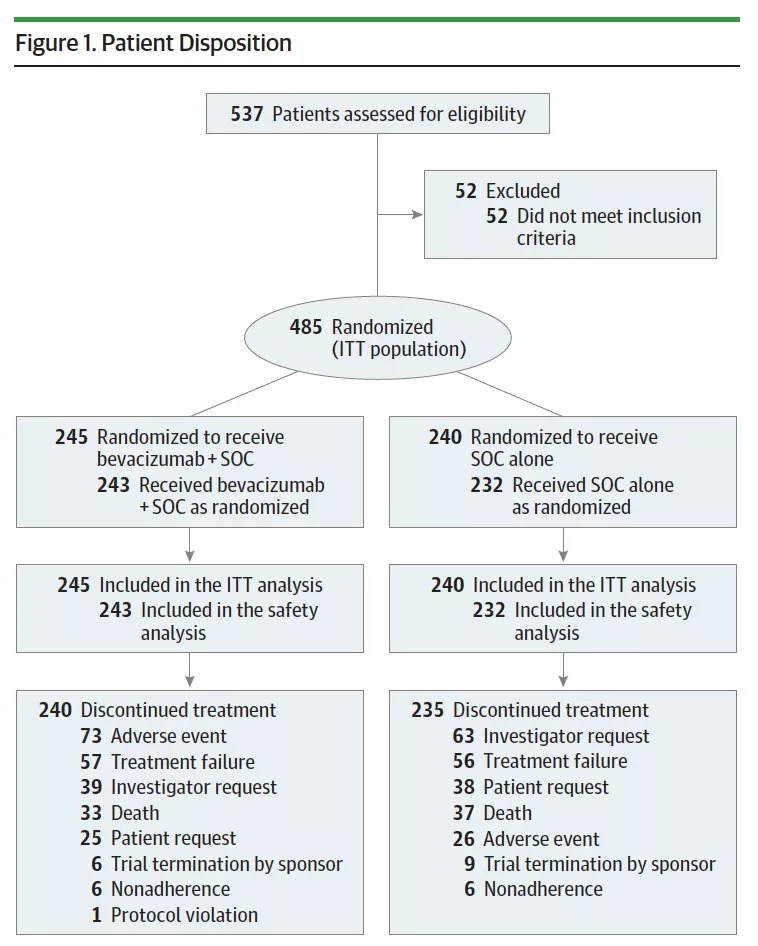 2011年6月至2015年1月,共485例患者参与随机,其中贝伐珠单抗组和标准治疗组分别为245例和240例;接受治疗的患者共475例,其中贝伐珠单抗组和标准治疗组分别为243例和232例,研究入组流程图见下图1,两组患者的基线特征均衡。