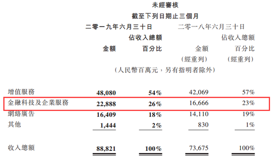 金融科技及企业服务收入为人民币228.88亿元,同比增长37%,占总收入的比例为26%,已成为腾讯第二大收入来源。