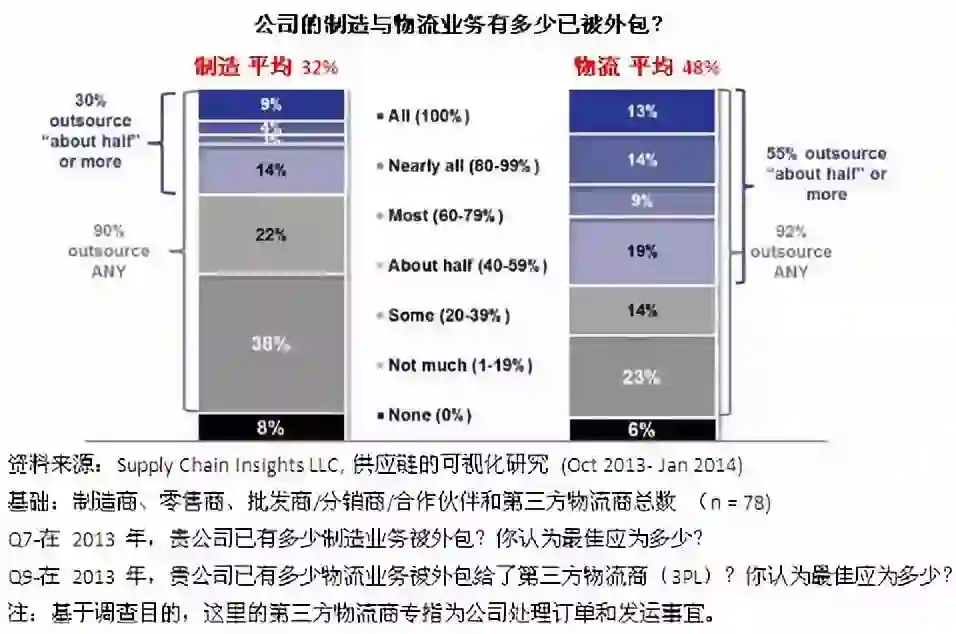 “外包”已是一个确定的现实。在我们的研究中,我们发现,平均下来,公司已外包了制造业务的32%和物流业务的48%。多方之间的信息流动不是线性的,信息复杂且相互交织在一起。一天之中,信息需要在多方之间流过很多次。采购订单平均需要更改一至两次。一个工业制造企业的零部件供应商表示:每个零部件平均一天有五个需求更改,他们已经从客户那里得到了 1800份电子数据表格。如图3“制造和物流外包概览”所示: