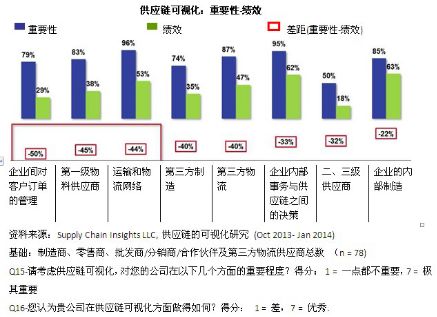 总之,企业之间的可视化、合作伙伴之间供应链的同步是刚需,需求的具体形式多种多样,包括跨多个层的供应商、物流商和合约制造商的可视化,它可以是“一对多”或“多对多”的。如图 1 所示,今天,企业内部部门之间的可视化程度水平要远远优于企业外部企业之间的可视化程度水平。可视化的需求和现实之间的差距越大,业务上的痛苦就越强烈。