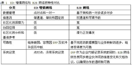 尽管ERP 系统也可触发EDI 信号从企业内部发给企业的贸易伙伴,但EDI 增值网络与B2B 网络相比,在七个不同的方面有很大差异: