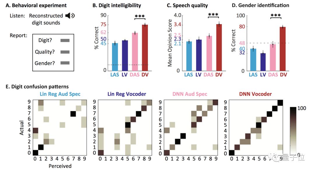 结果显示,非线性深度神经网络(DNN)+声码器组合(红色,DV)的还原度最高,志愿者的正确还原率达到了75%,且MOS得分最高,达到了3.4分。