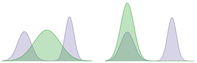 要从稀疏奖励中学习,有效的探索对于寻找一系列成功轨迹而言至关重要。在 论文 中,我们利用 Kullback–Leibler (KL) 散度的 两个方向 来解决这一挑战,KL 散度是两种概率分布差异程度的衡量指标。在下面的示例中,我们使用 KL 散度来最小化固定双峰(紫色阴影)和学习后高斯(绿色阴影)分布之间的差异,这可以分别代表智能体的最优策略和学习后策略的分布。KL 对象的一个方向学习一个分布,该分布试图涵盖这两种模式,而其他对象学习的分布都寻求某种特定模式(即它对某个模式的偏好胜过另一个)。我们的方法利用包含 KL 集中于多个峰值这一倾向的模式来收集多元化的成功轨迹,并利用在轨迹间寻找 KL 隐含偏好的模式来学习稳健的策略。