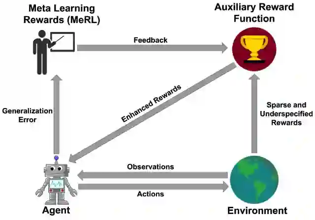 MeRL 示意图:通过从辅助奖励模型中获得的奖励信号来训练 RL 智能体,同时使用智能体的泛化误差来训练辅助奖励