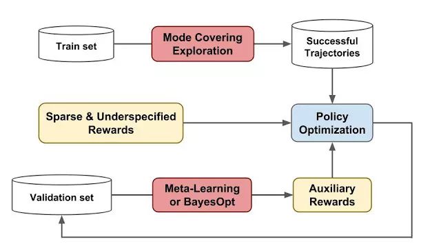 我们所提方法的概览。我们采用 (1) 涵盖探索模式,在内存缓冲区收集了一组多样化的成功轨迹;(2) 元学习或贝叶斯优化,学习能够为策略优化提供更精确反馈的辅助奖励
