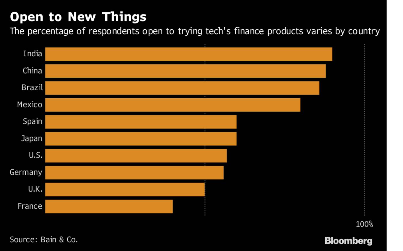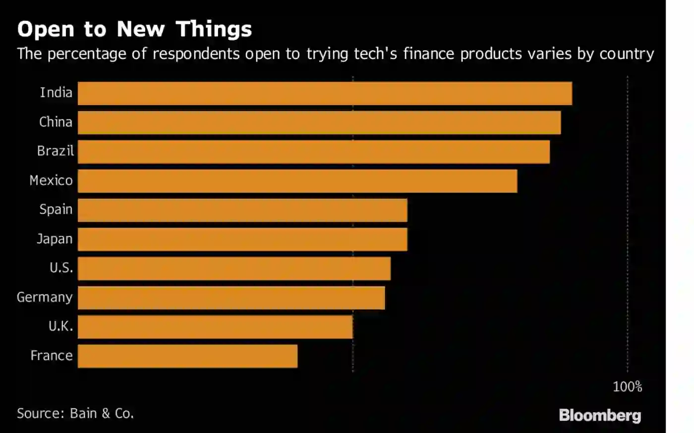 贝恩咨询对22个国家133171人的调查研究显示,不同国家的受访者态度差异很大。在印度和中国,超过80%的受访者表示愿意尝试科技公司的新金融服务,接受率比排名最低的法国高出一倍多。