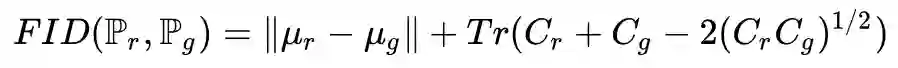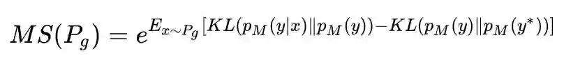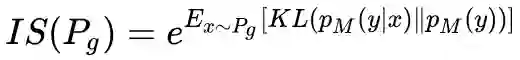 Pg 表示生成数据分布,Pr 表示真实数据分布,E 表示数学期望,x 表示输入样本,x~Pg 表示 x 为生成样本的采样,x~Pr 表示 x 为真实样本的采样。y 表示样本标签,M 表示分类网络,通常选择 Inception network。