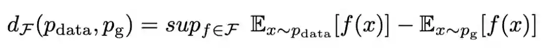 IPM 定义了一个评价函数族 f ,用于度量任意两个分布之间的距离。在一个紧凑的空间中,定义 P(x) 为在 x 上的概率测度。那么两个分布 Pdata,Pg 之间的 IPM 可以定义为如下公式: