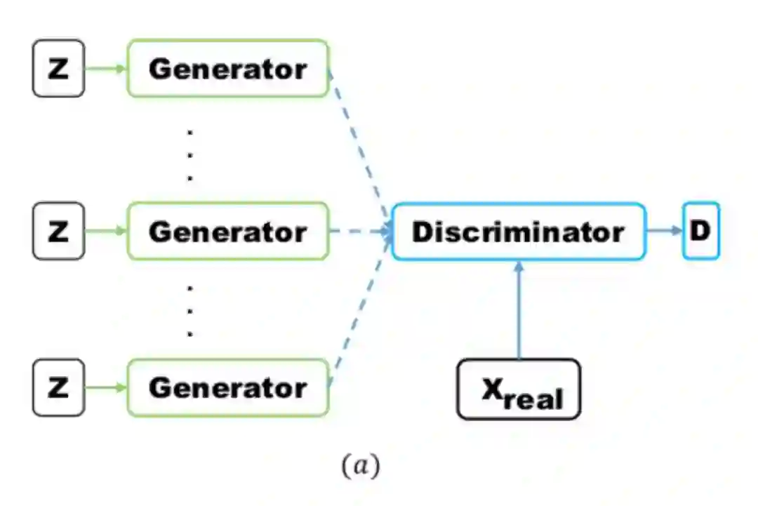 Multi agent diverse GAN (MAD-GAN) 采用多个生成器,一个判别器以保障样本生成的多样性。具体结构如下: