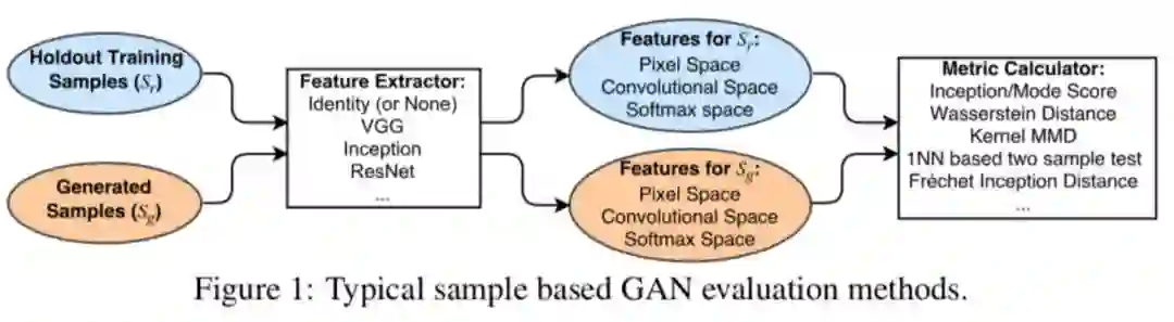 GAN 的评价方法多种多样,现有的 example-based(顾名思义,基于样本层面做评价)方法,均是对生成样本与真实样本提取特征,然后在特征空间做距离度量。具体框架如下: