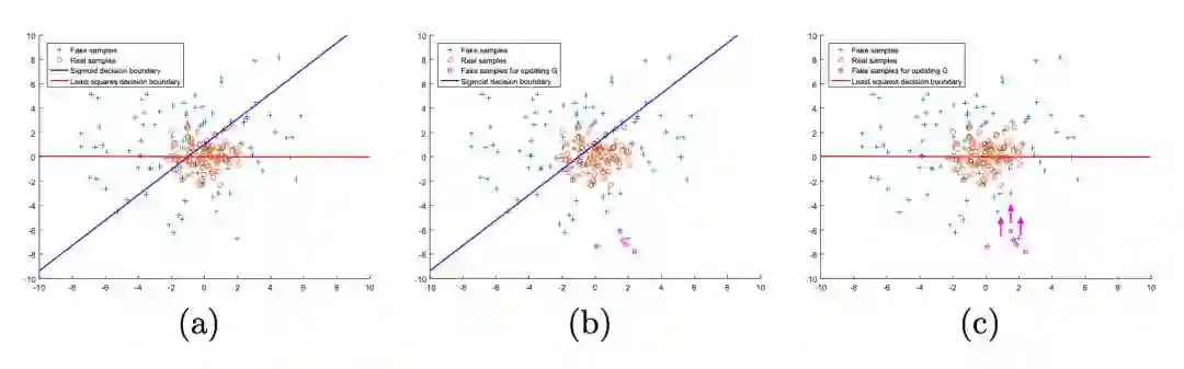 上图 b 中,一些离决策面比较远的点,虽然被分类正确,但是这些并不是好的生成样本。传统 GAN 通常会将其忽略。而对于 LSGAN,由于采用最小二乘损失,计算决策面到样本点的距离,如图 c,可以把离决策面比较远的点“拉”回来,也就是把离真实数据比较远的点“拉”回来。
