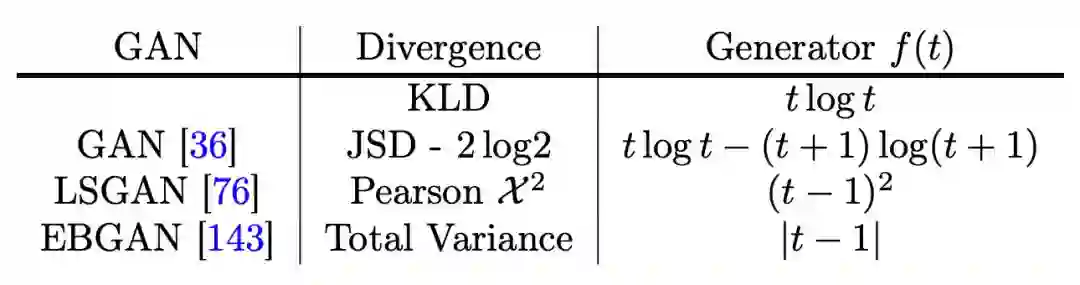 上述公式中 f 为凸函数,且 f(1)=0 。采用不同的 f 函数(Generator),可以得到不同的优化目标。具体如下: