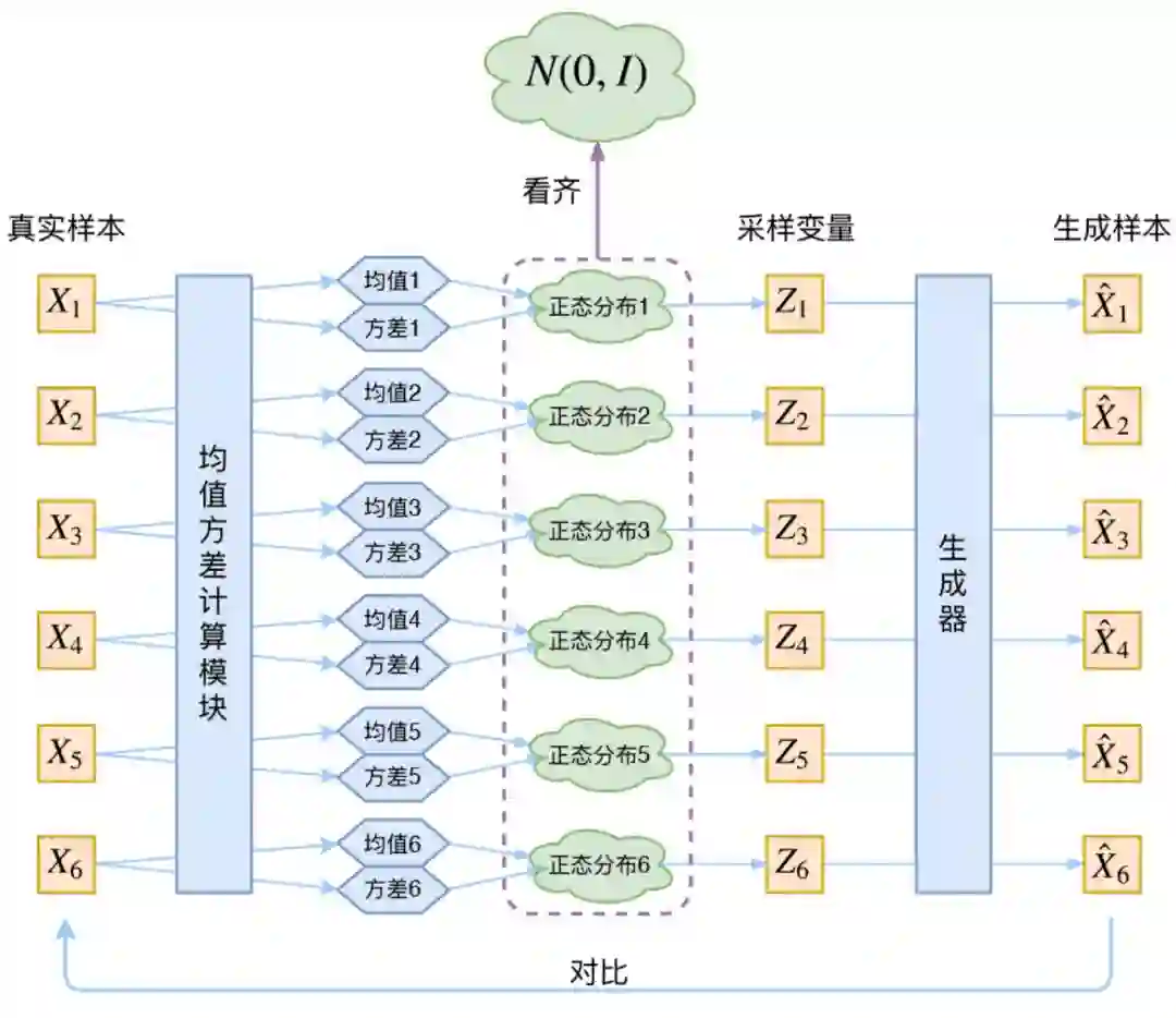 3. GAN 使用判别器去度量映射 X=G(z) 的优劣,而 VAE 通过隐变量 z 与标准正态分布的 KL 散度和重构误差去度量。