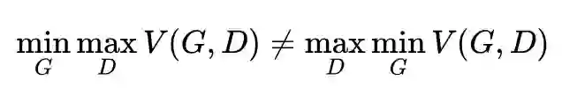 如果我们只迭代一次判别器,然后迭代一次生成器,不断循环迭代。这样原先的极小极大问题,就容易变成极大极小(maxmin)问题,可二者是不一样的,即:
