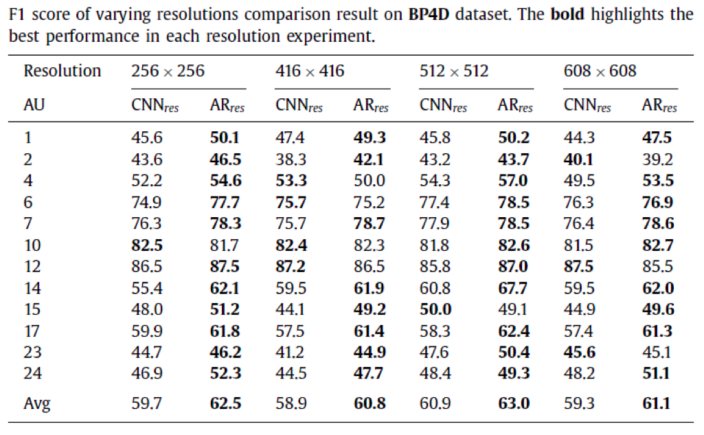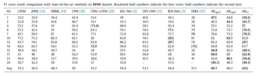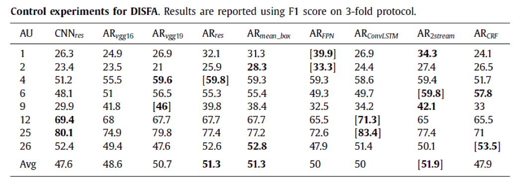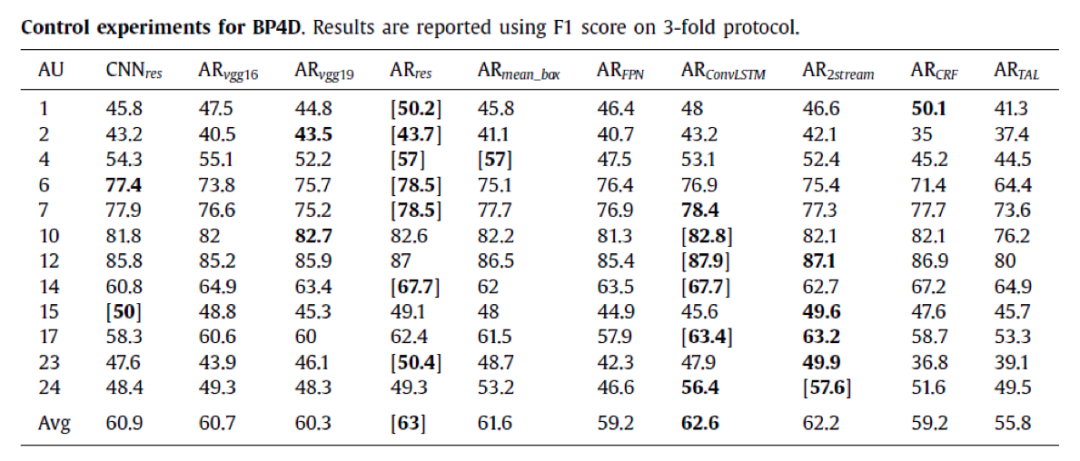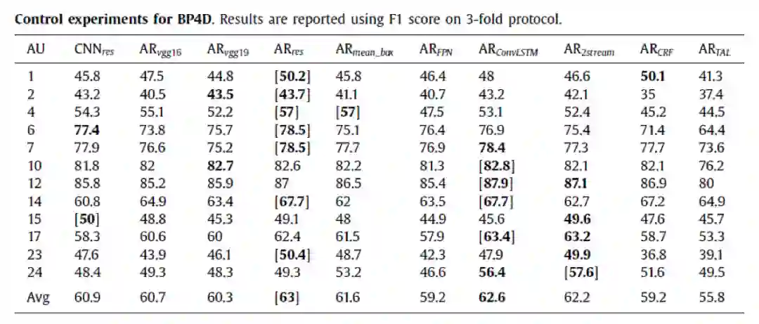 实验在BP4D和DISFA两个数据库上进行,该文的实验部分值得称道的一点是,作者采用了标准的AU R-CNN,并在ResNet-101和VGG-16、VGG-19几个网络上进行测试: