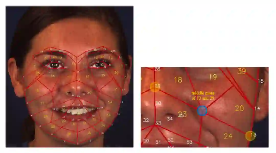AU R-CNN的方法框架如图2所示,AU检测最困难之处在于人脸的五官大小不定,每个人长相不同,而且发出的表情的位置也不相同,这种充满挑战性的难题如何检测呢?本文站在前人的肩膀上,利用人脸关键点!人脸关键点提供了丰富的人脸位置信息,若能充分利用,则消除了五官的差异,更能细微精确地检测AU。所以该框架首先将人脸划分成不同的区域,每个区域独立地进行检测,如图2所示:
