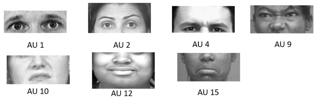 。因为AU只是面部肌肉的细微运动,而且不同的面部肌肉运动幅度大小不同,所以AU检测任务具有挑战性。AU 检测在测谎仪、汽车驾驶辅助系统(探测是否驾驶员瞌睡)等有重要应用。