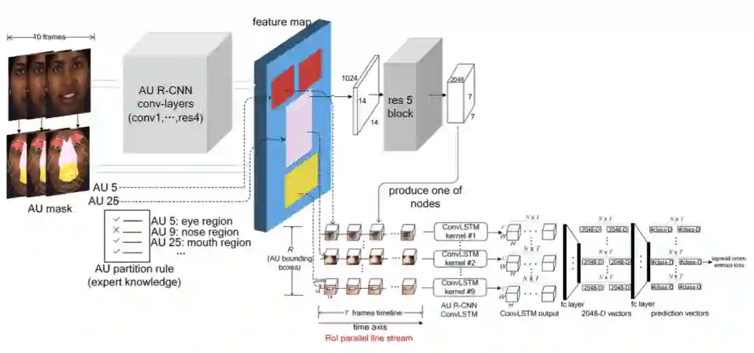 AU R-CNN可以被作为一个基础框架产生出来很多扩展和变种,这是由于视频的先后帧之间有时间顺序关系,所以可以使用ConvLSTM建模先后帧之间的关系。如下图所示,每个部位的小box被单独的时间轴建模,用一个独立的ConvLSTM去建模并学习。