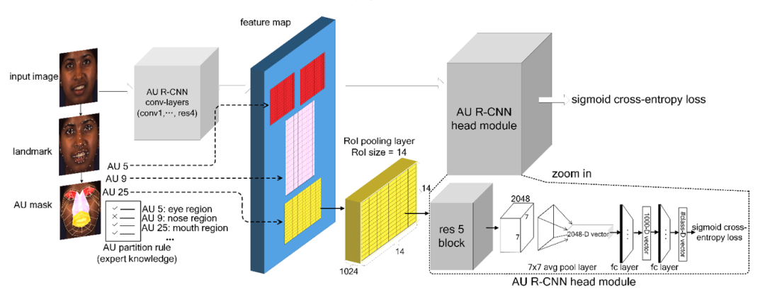 图 5. AU R-CNN整体网络结构图,左侧由先验知识截取出不同区域的bounding box,右侧是检测头去分别检测,与此同时,ground-truth label也被按照不同区域分割了,最后计算sigmoid cross entropy损失。