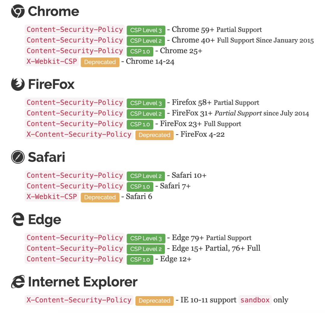 CSP规定了一个叫Content-Security-Policy 的信息,网站通过这个信息告诉浏览器哪些外部资源可以加载和执行。这个信息可以用HTTP头的形式出现,像这样: