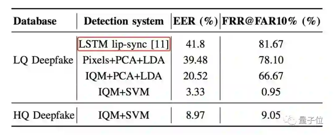 IQM+SVM,高清测试的EER只有8.97%,低清测试的EER只有3.33%。这样看来,奏效的依然是基于图像的算法。