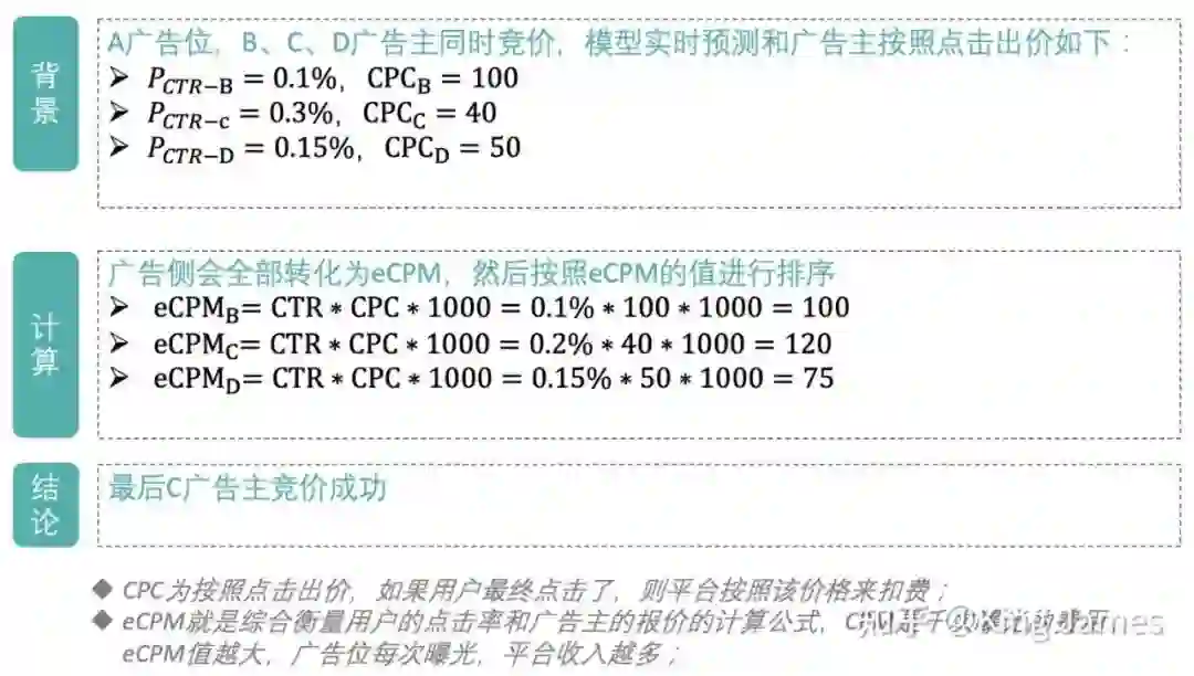 像上图中B广告主虽然出价高,但是模型预测用户的CTR很低,最终用户点击的次数会很少。因为广告一般都是按照点击进行扣费的,用户必须点击平台侧才可以扣广告主的费用。所以最终C竞价成功,对于平台侧来说曝光C的广告,预期收入是最大的。
