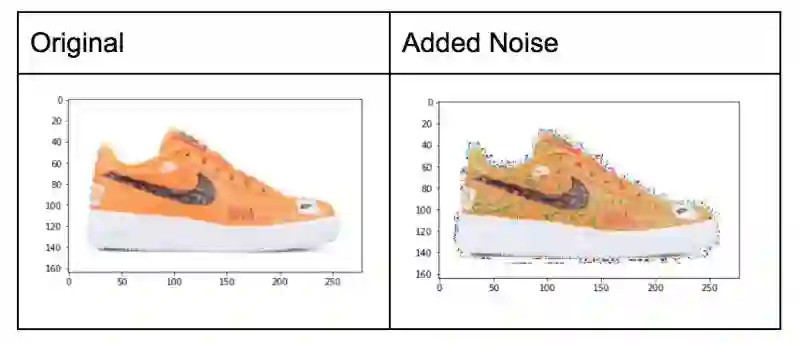 噪点是一种有趣的增强技术。 我已经看过很多关于对抗训练的有趣论文,你可以将一些噪点投入到图像中,因此模型无法正确分类。 但我仍然在寻找产生比下图更好的噪点的方法。 添加噪点可能有助于光照畸变并使模型更加鲁棒(编者就2:意思是这里让边缘光照发生失真,让尺度不变的情况下特征转变(SIFT),从而能增加鲁棒性(SURF),使得识别更加准确 ,不过,看这文章的水平应该是我多虑了)。