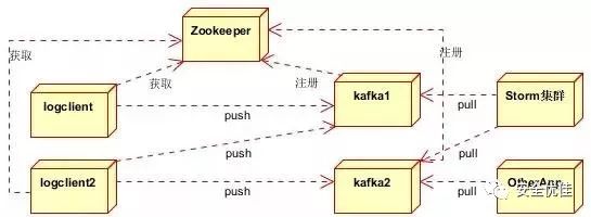 分为Zookeeper注册中心,日志收集客户端,Kafka集群和Storm集群(OtherApp)四部分组成。