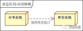 场景说明:用户下单后,订单系统需要通知库存系统。传统的做法是,订单系统调用库存系统的接口。如下图: